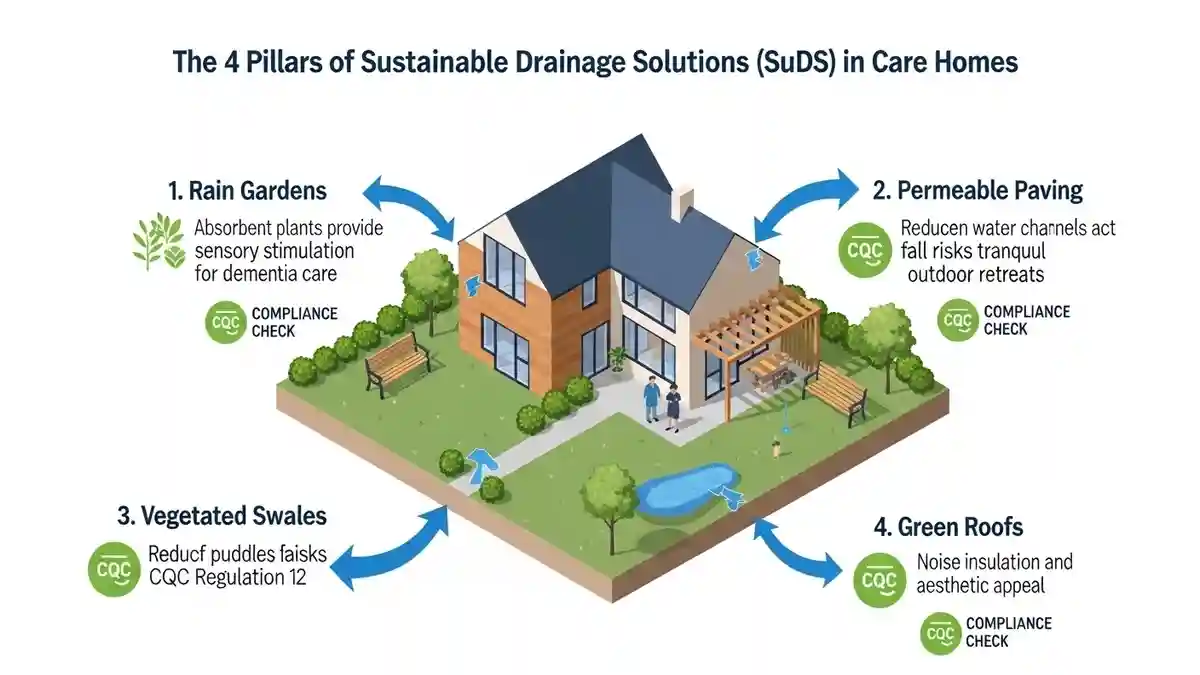 The future of sustainable drainage solutions CQC care home design is the integration of SuDS (Sustainable Drainage Systems). In Hornchurch, Policy EN18 of the Local Plan encourages SuDS to manage surface water runoff, which often plagues the surrounding area.